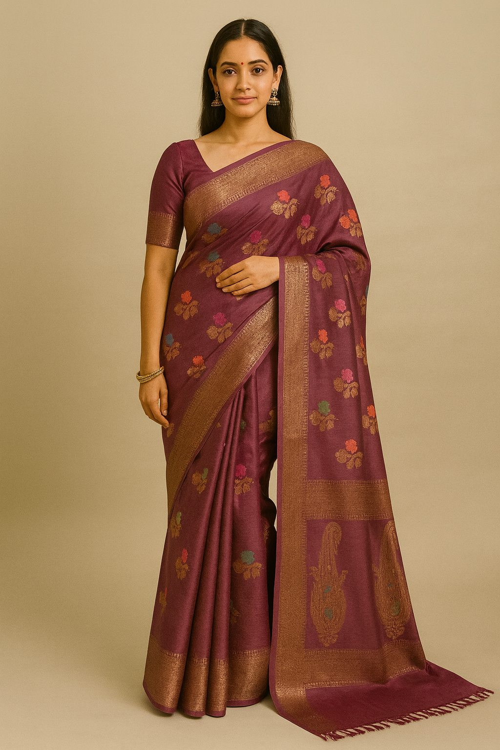 Gracefully woven in deep wine, this pure muga tussar saree showcases multicolor floral buta with a grand zari pallu featuring traditional paisley-style motifs. A stunning choice for cultural elegance.