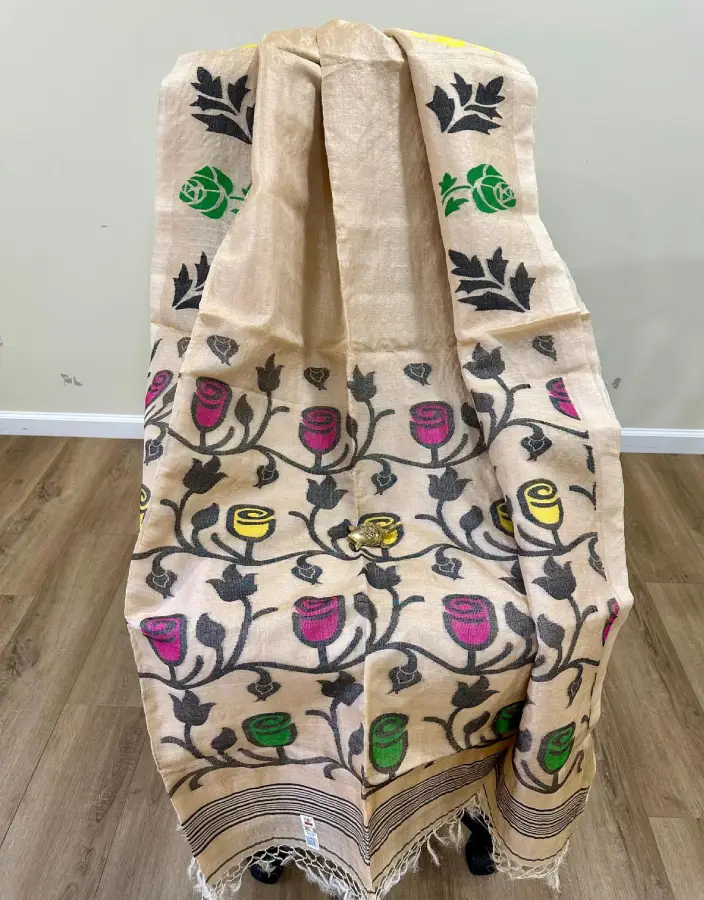 Brighten your ethnic wardrobe with this soft cream color tussar jamdani saree featuring bold rose woven motifs in pink, green, and yellow—perfect for festive daywear and vibrant gatherings.