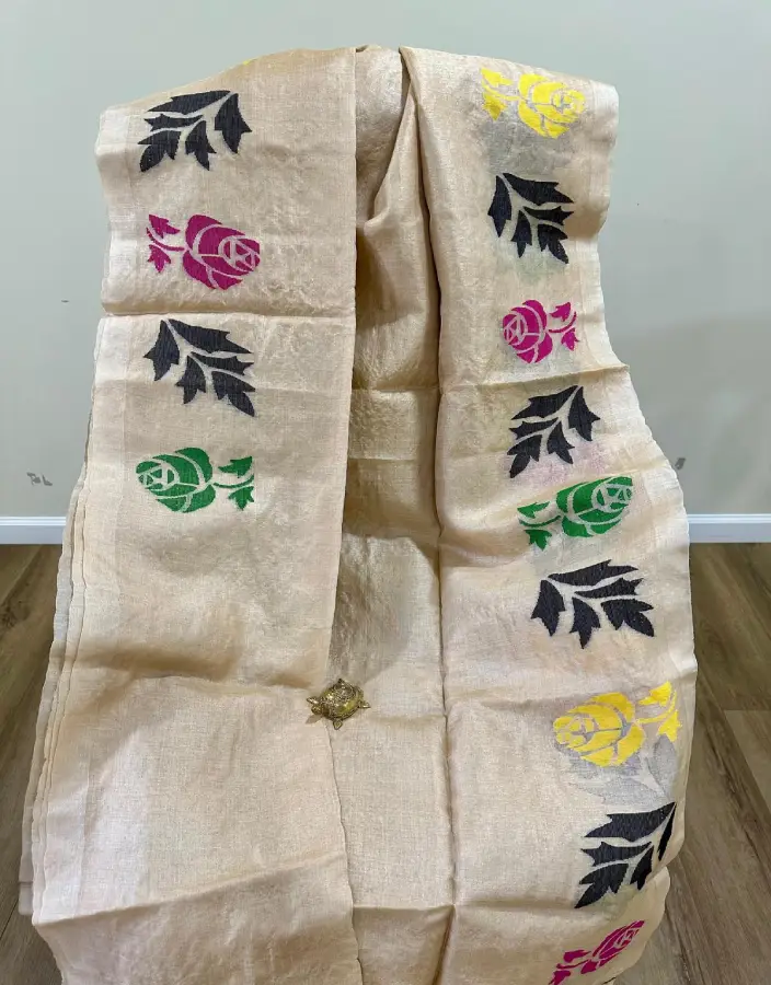 Bring color and comfort together with this vibrant soft cream color tussar jamdani saree from Nine Yards Of Bengal. Adorned with oversized woven rose motifs in shades of pink, green, and yellow, this saree offers a playful yet dignified look that’s ideal for women who love vibrant traditional wear.