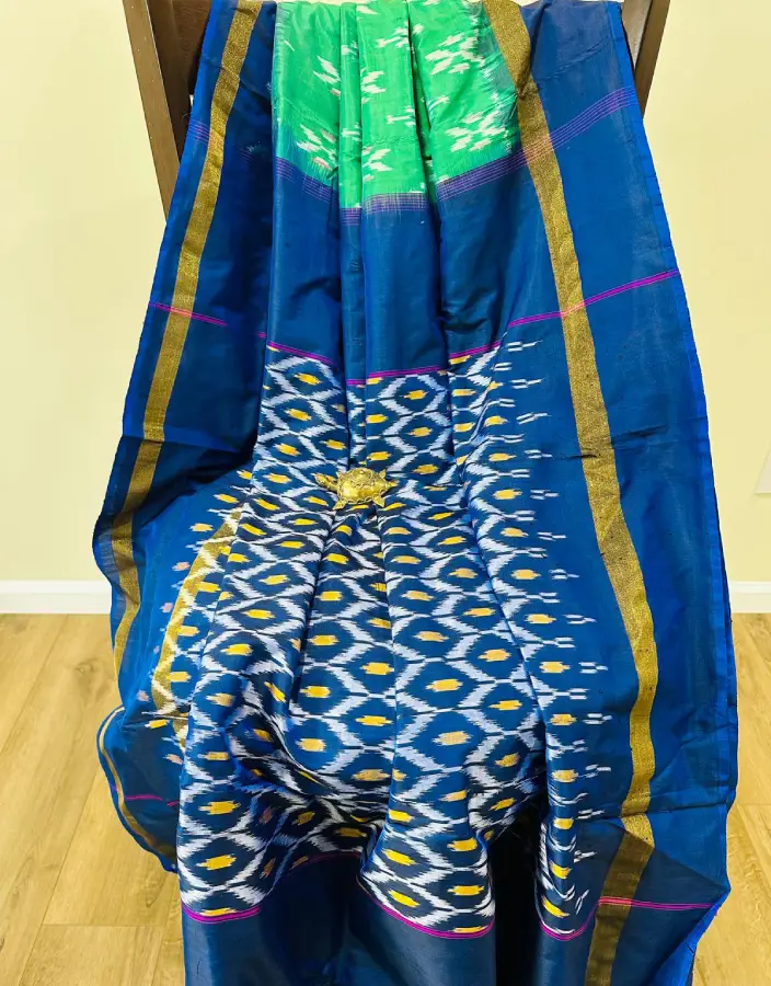 Exquisite this Green and blue Ikkat silk saree with traditional weave with checks designed body and vibrant hand-embroidered royal blue pallu and borders—ideal for festive and casual elegance.