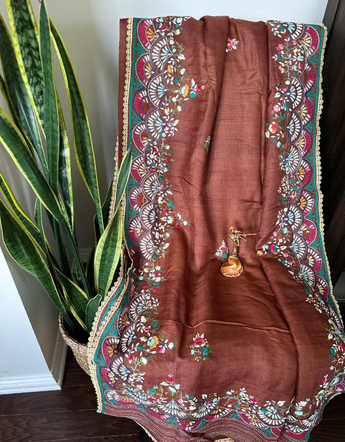 Rust Brown Tussar Saree with Dual Floral Border Parsi Bullian Embroidery